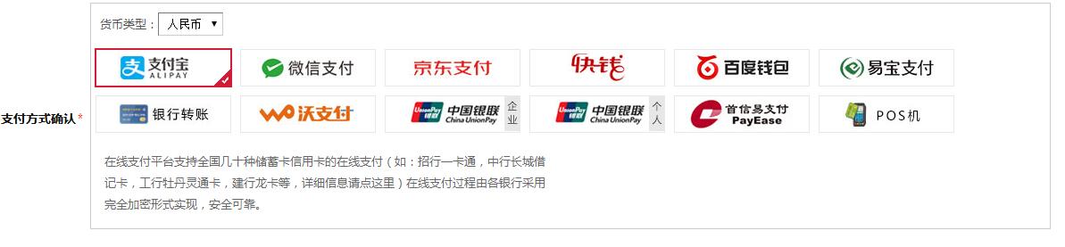 在線支付方式:支付寶、微信支付、塊錢、京東支付、百度錢包、易寶支付、沃支付、首信易支付。