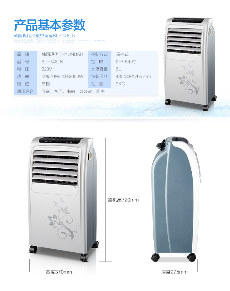 • 韓國現(xiàn)代(HYUNDAI)BL-148LN遙控冷暖兩用空調扇/冷風扇/冷風機/電風扇/電暖器