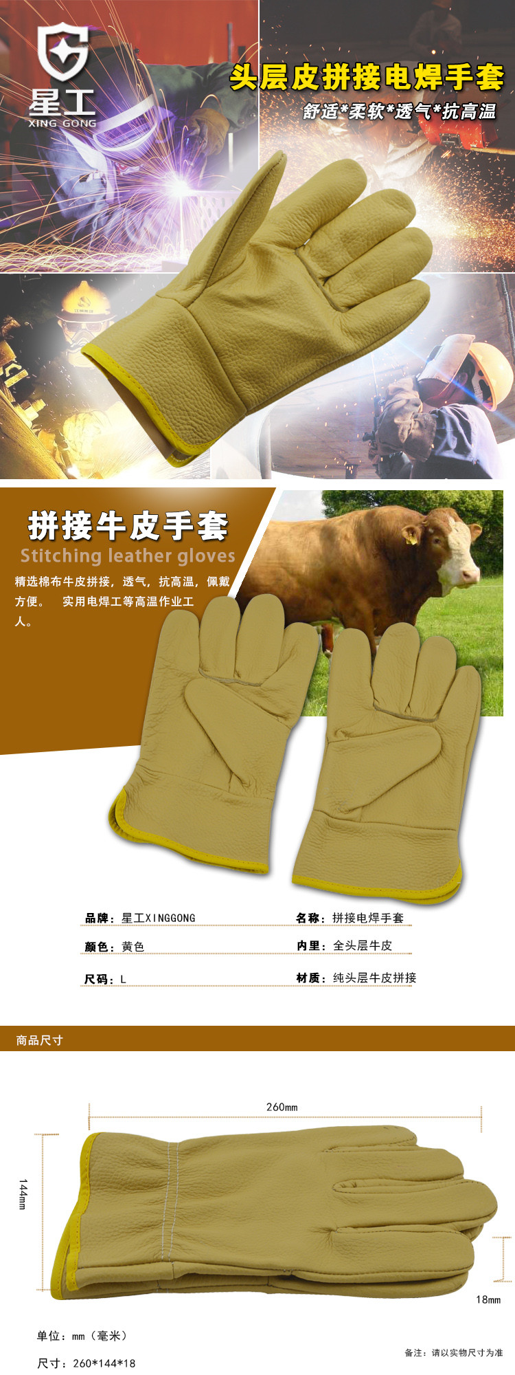 • 商品名稱:星工(XINGONG) 全牛皮電焊手套 耐磨勞保防護手套