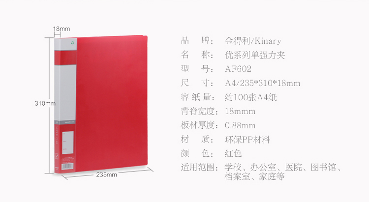 • 商品名稱:金得利(KINARY) AF602 A4單強(qiáng)力文件夾 紅色