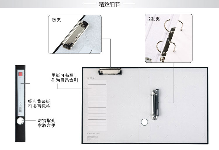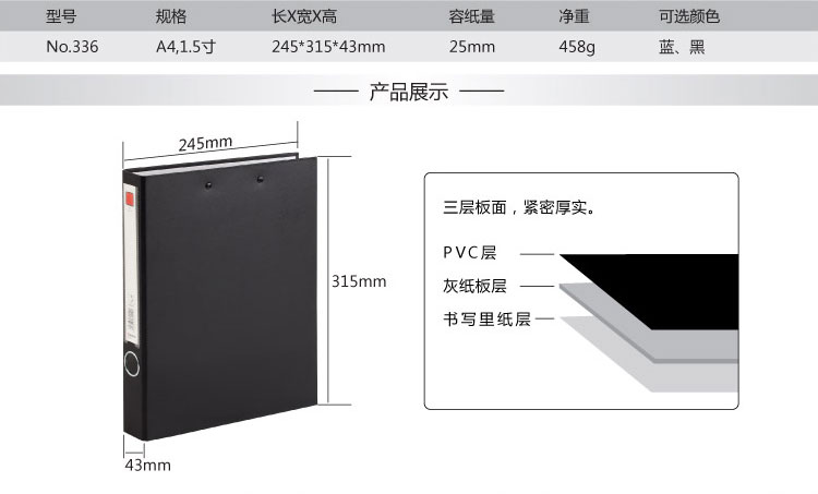 • 商品名稱:齊心(Comix) NO.336 A4紙板文件夾/資料夾/2孔D型夾+板夾黑色 辦公文具
