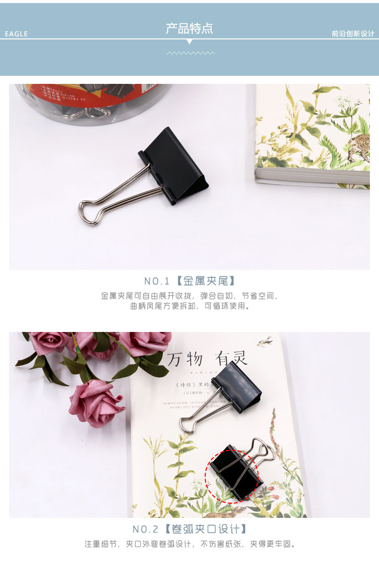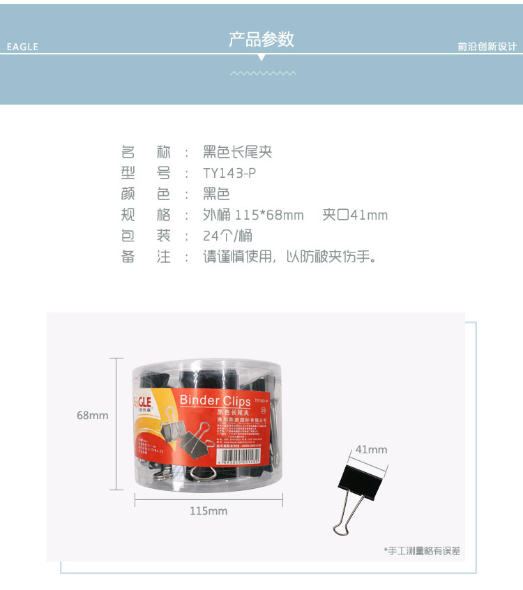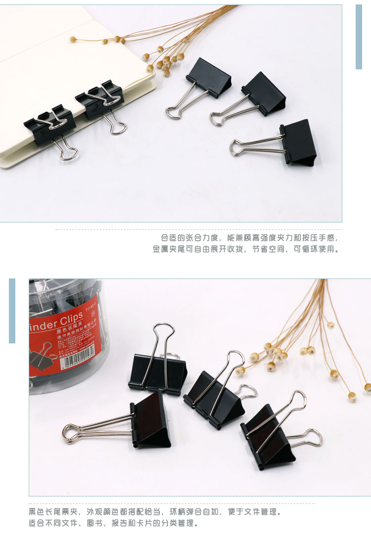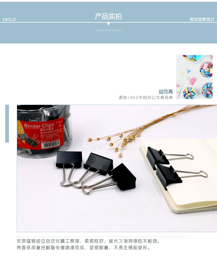• 商品名稱(chēng):益而高(EAGLE)24只裝41mm黑色長(zhǎng)尾夾 中號(hào)燕尾夾子金屬文件夾票據(jù)夾辦公文具 1桶裝 TY143-P