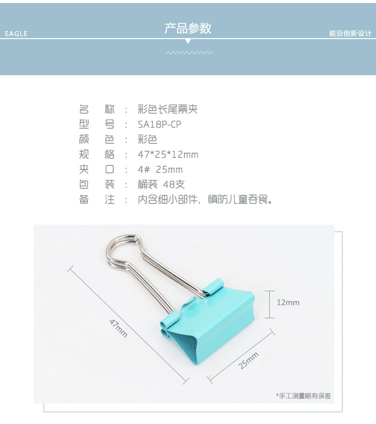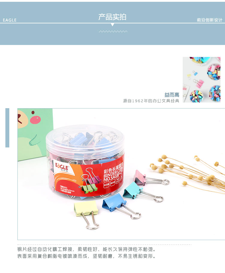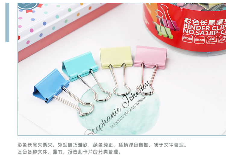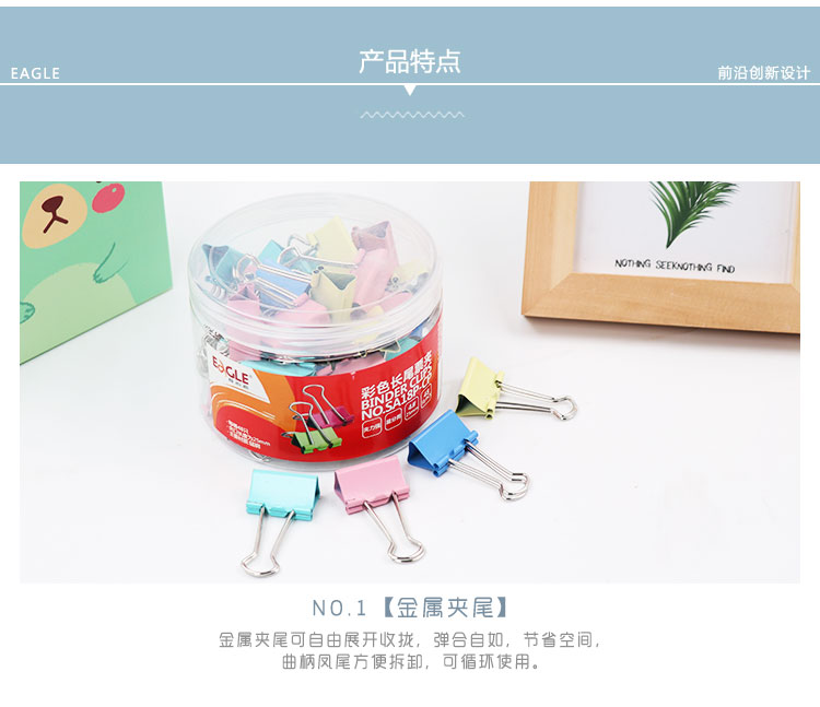 • 商品名稱:益而高(EAGLE)48只裝25mm彩色長尾夾 中號燕尾夾子金屬文件夾票據(jù)夾辦公文具 1桶裝 SA18P-CP