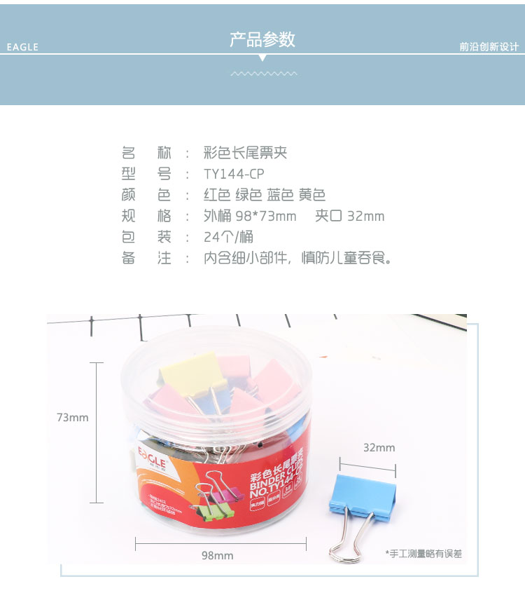 • 商品名稱:益而高(EAGLE)24只裝32mm彩色長尾夾 中號燕尾夾子金屬文件夾票據(jù)夾辦公文具 1桶裝 TY144-CP