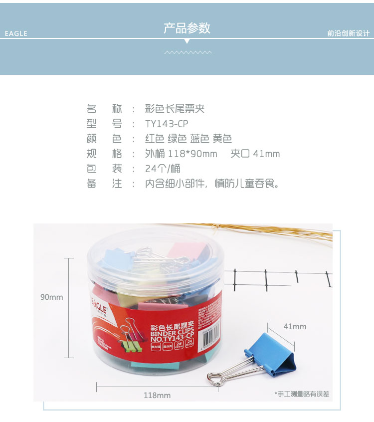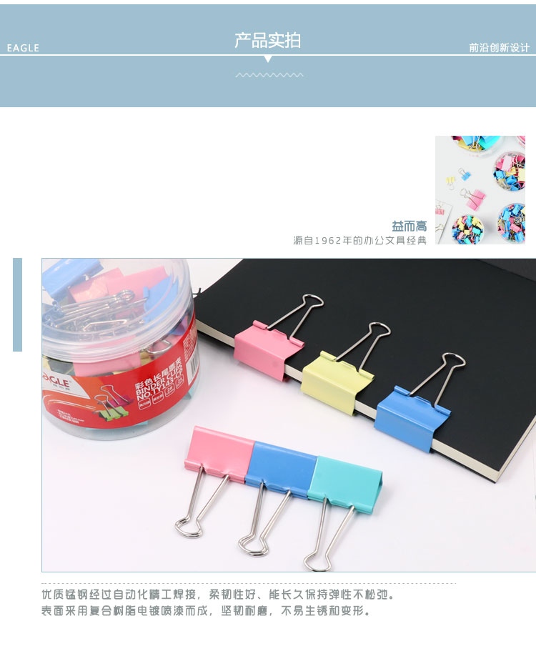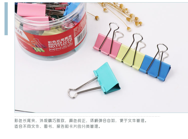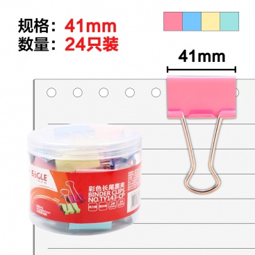 • 商品名稱:益而高(EAGLE)24只裝41mm彩色長尾夾 中號(hào)燕尾夾子金屬文件夾票據(jù)夾辦公文具 1桶裝 TY143-CP
