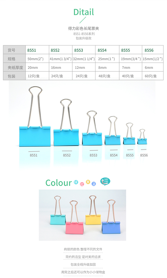 • 商品名稱(chēng):得力(deli)12只50mm彩色長(zhǎng)尾票夾 金屬票據(jù)夾燕尾夾鐵夾子 大號(hào)8551
