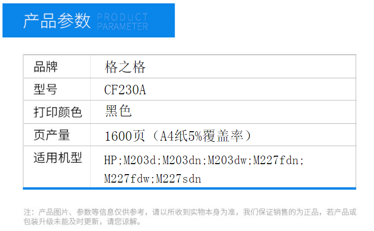 • 商品名稱:格之格CF230A粉盒帶芯片適用惠普M203d M203dn M203dw M227fdn M227fdw打印機(jī)粉盒hp30A硒鼓