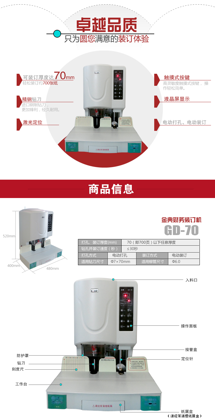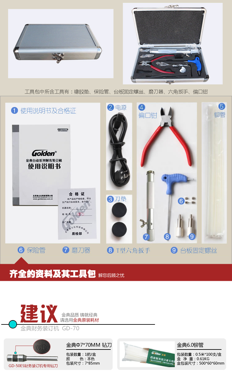 • 商品名稱:金典(Golden)GD-70裝訂機(jī)財(cái)務(wù)憑證裝訂機(jī) 檔案打孔機(jī) 7厘米鉚管裝訂機(jī)