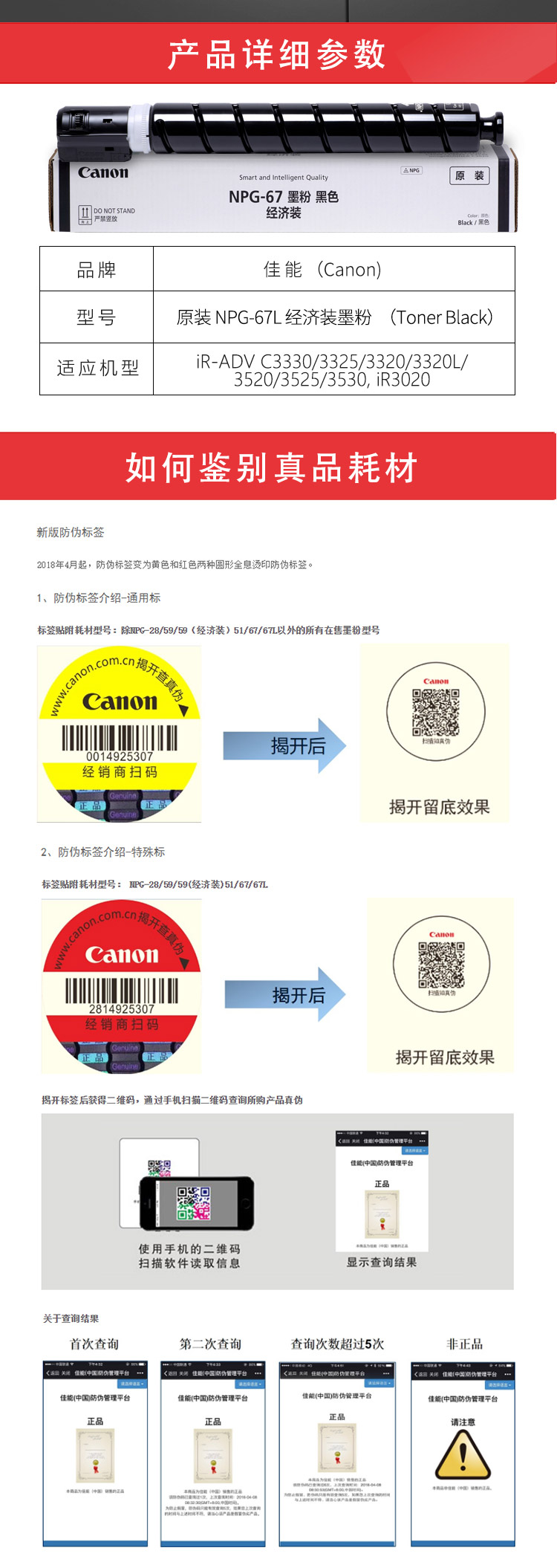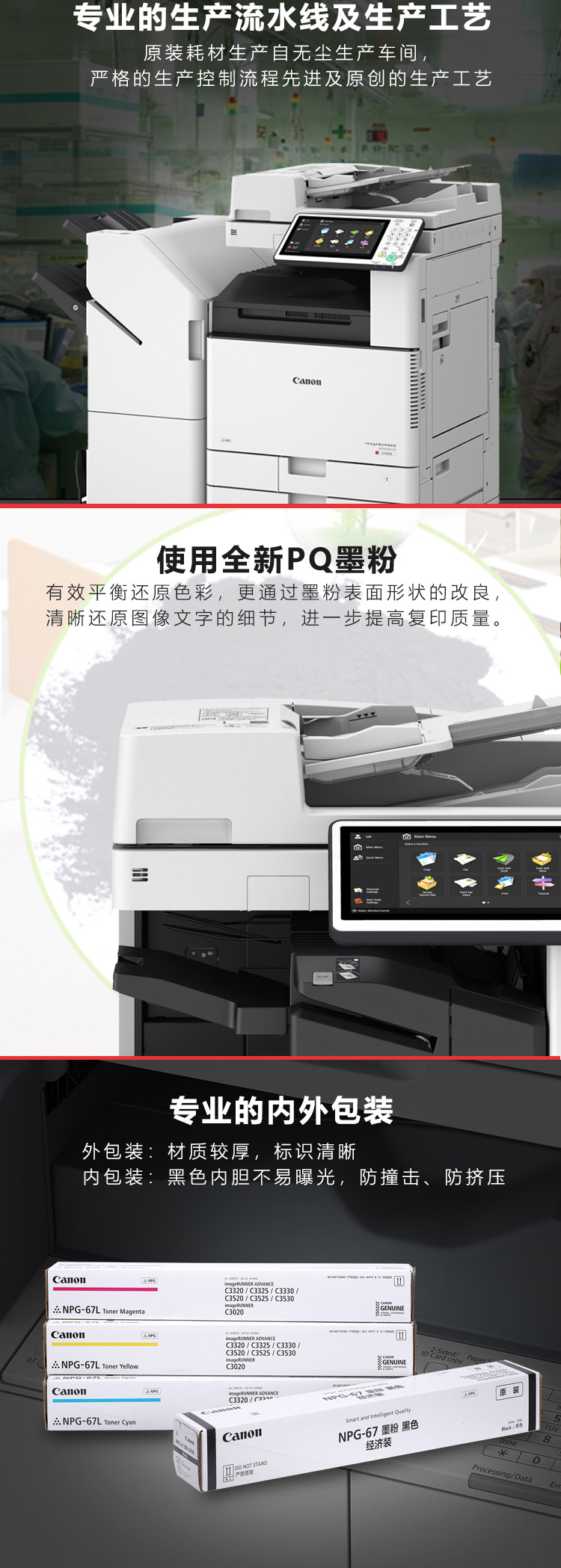 • 商品名稱:佳能(Canon)NPG-67L BK原裝黑色小容量墨粉(C3020/3025/3120L/3120/3125/33系列/3520/3525/3530/37系列)