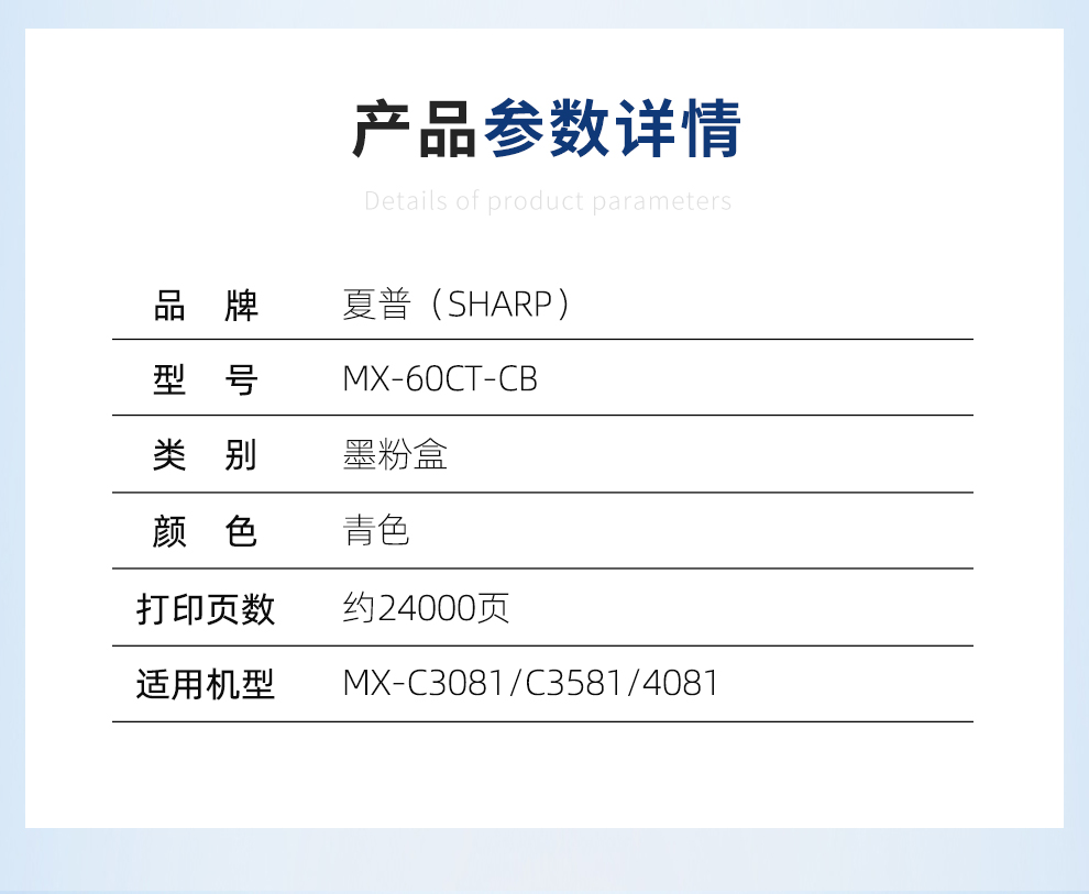 • 商品名稱(chēng):夏普(SHARP)MX-60CT-CB 青色墨粉盒(適用MX-C3081/C3581/4081機(jī)型)約24000頁(yè)