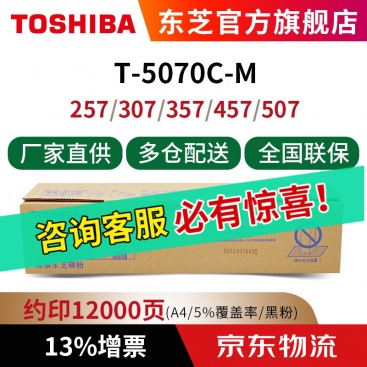 • 商品名稱:東芝(TOSHIBA) T-5070原裝粉盒系列東芝257粉盒適用307/357/457/507 T5070C-M標準裝(約12000張)