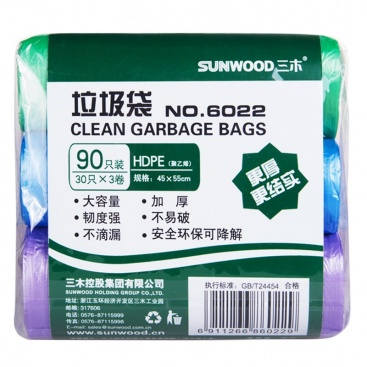 • 三木(SUNWOOD) 45×55cm加厚垃圾袋/垃圾分類 3卷90只 藍紫綠 6022