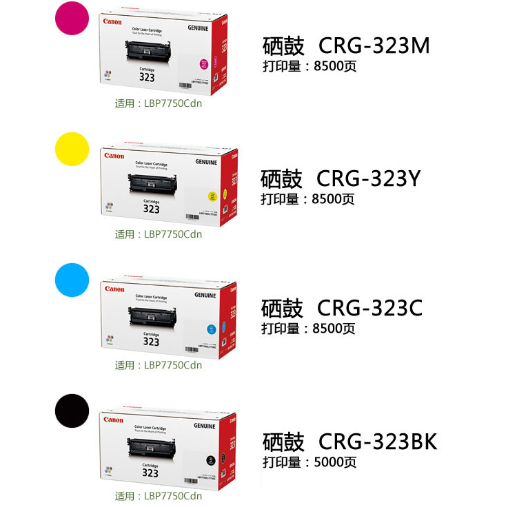 • 商品名稱:佳能(Canon) CRG-323原裝硒鼓 適用于佳能LBP7750cdn 佳能323硒鼓套裝四色