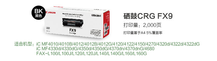 • 商品名稱:佳能(Canon)硒鼓FX-9 黑色(適用L100 MF4120 4010)