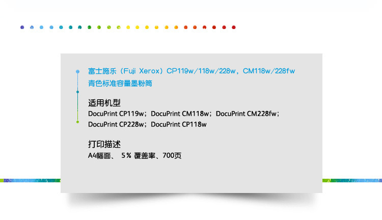 • 商品名稱:富士施樂(Fuji Xerox)CP119w/118w/228w,CM118w/228fw青色標(biāo)準(zhǔn)容量墨粉筒,粉盒,碳粉,耗材