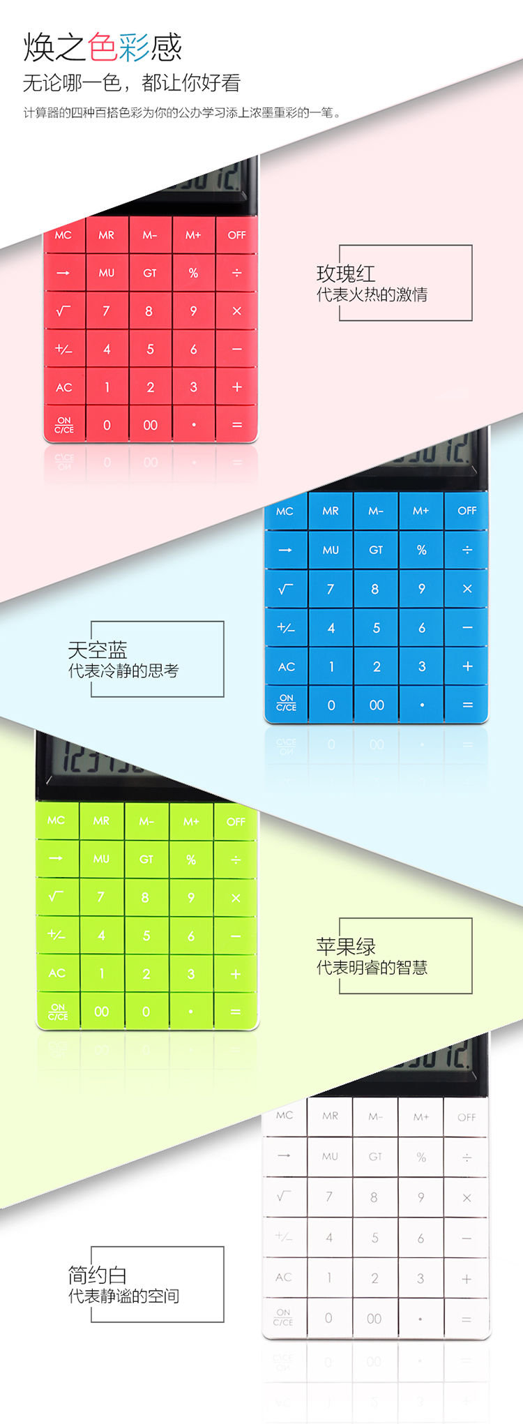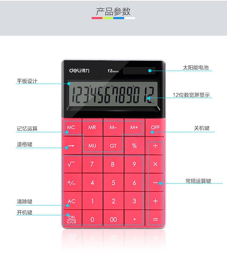 • 商品名稱:得力(deli)雙電源時(shí)尚彩色平板式計(jì)算器 12位無(wú)縫按鍵桌面計(jì)算機(jī) 紅色1589