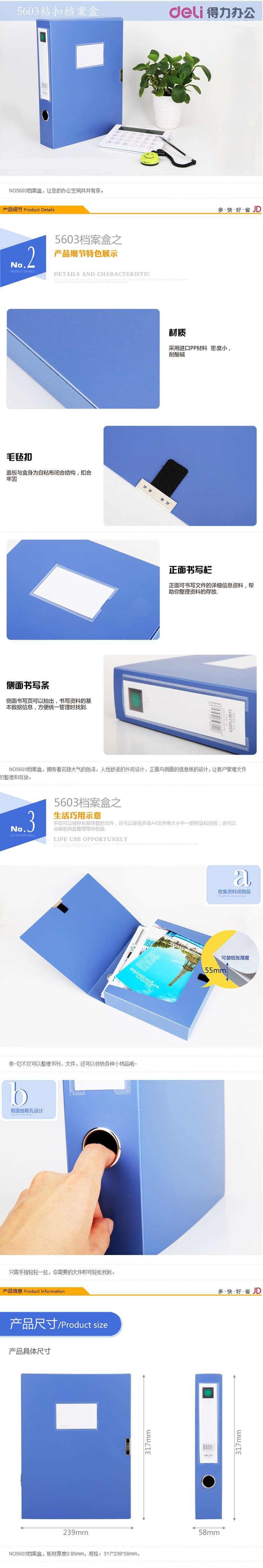• 商品名稱:得力(deli)12只 55mm加厚大容量粘扣檔案盒 A4文件盒資料盒 藍(lán)5603