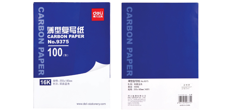• 商品名稱:得力(deli)16K經(jīng)濟(jì)耐用薄型復(fù)寫紙(25.5*18.5cm) 100張/盒 藍(lán) 9375