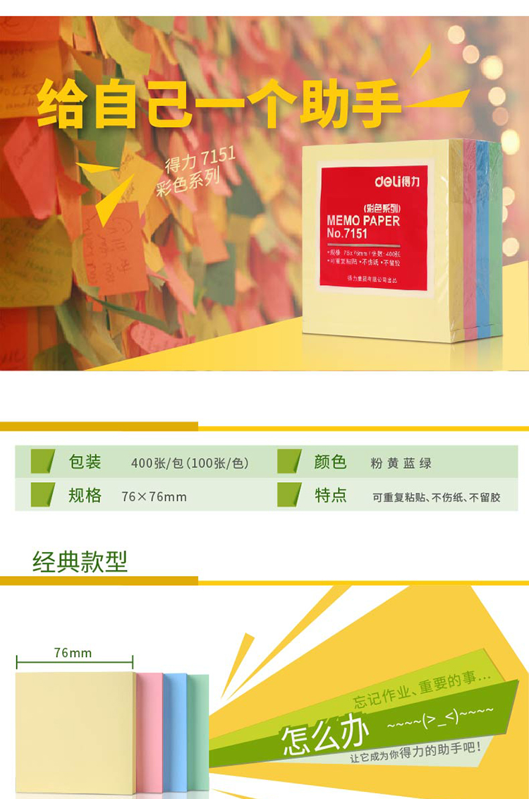 • 商品名稱:得力(deli)400頁(yè)4色便簽紙便利貼 76*76mm 7151