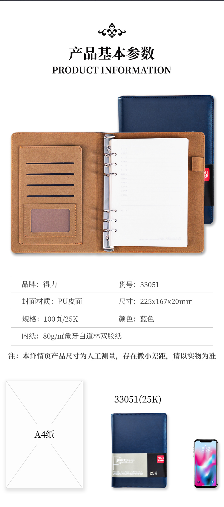 • 商品名稱:得力(deli)25K100張高檔領導款活頁皮面本 商務辦公記事本筆記本子 藍33051