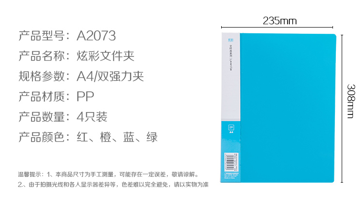 • 商品名稱:廣博(GuangBo)4只裝4色高質(zhì)感長壓夾文件夾板/資料夾/檔案夾 炫彩A2073