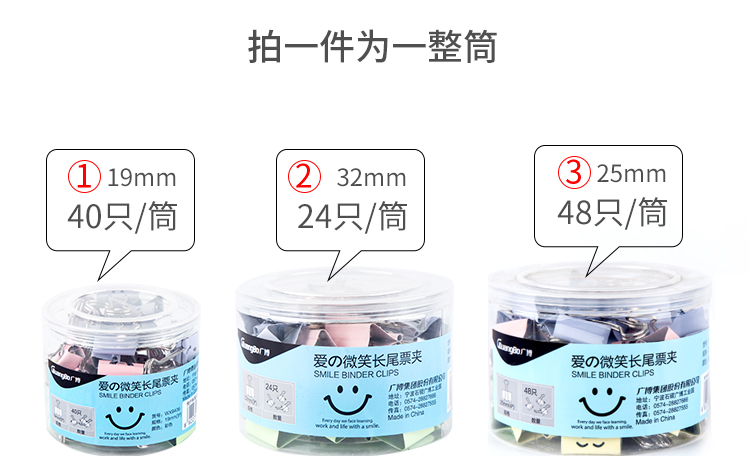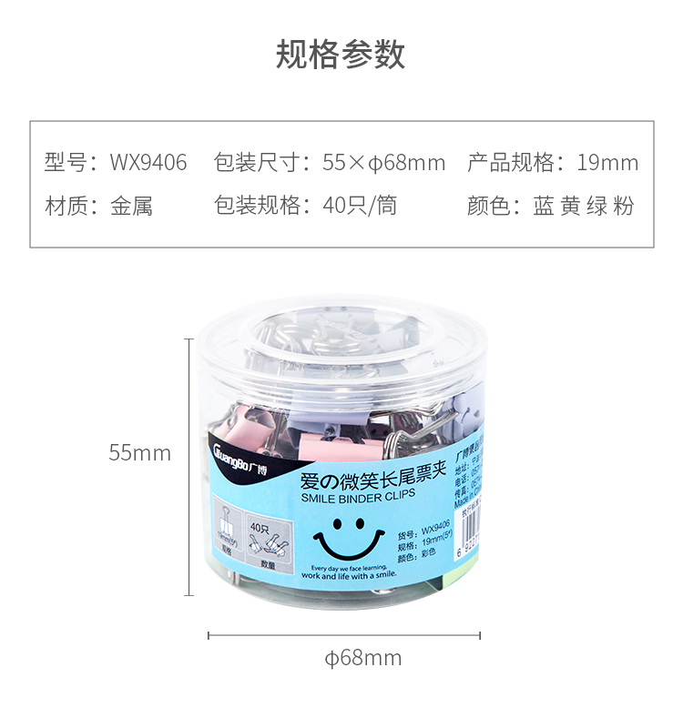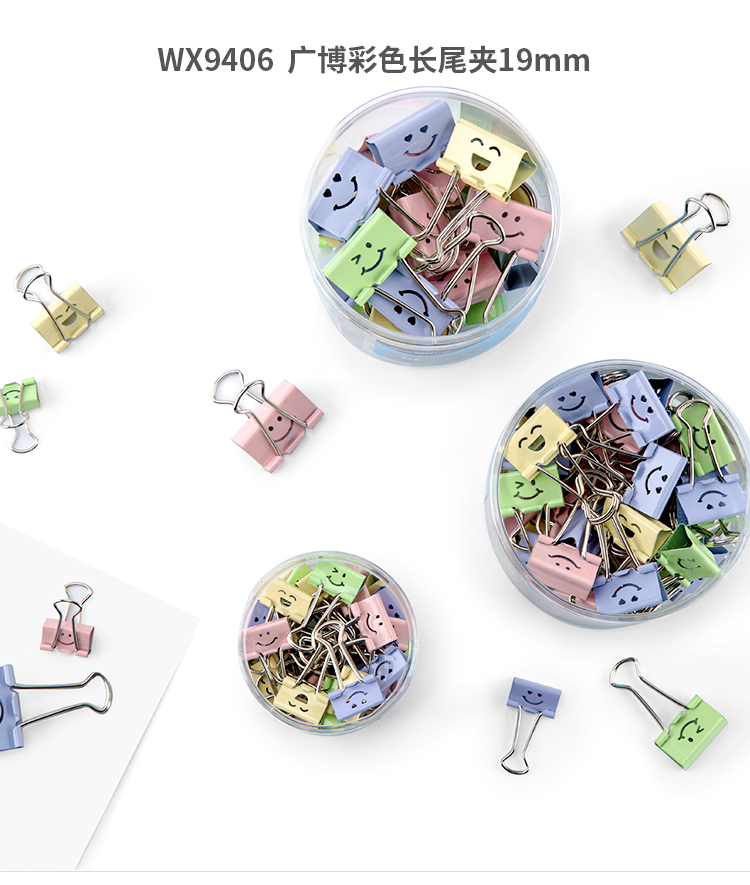• 商品名稱:廣博(GuangBo)40只裝彩色長尾夾子19mm燕尾夾長尾票夾愛の微笑WX9406