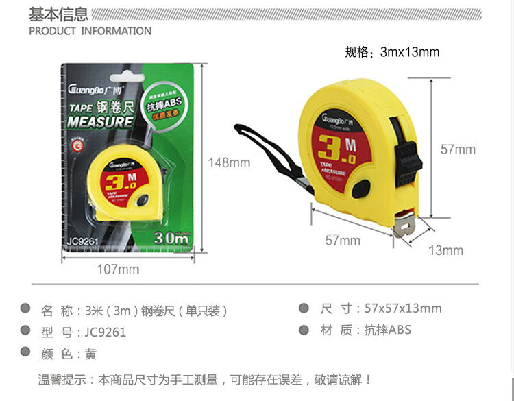 • 商品名稱:廣博(GuangBo)3米(3m)雙制動鋼卷尺辦公文具JC9261