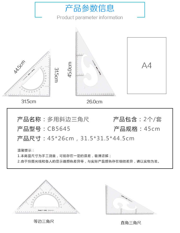 • 商品名稱:廣博(GuangBo)2把裝45CM直角三角尺子+等腰三角板含量角器文具CB5645