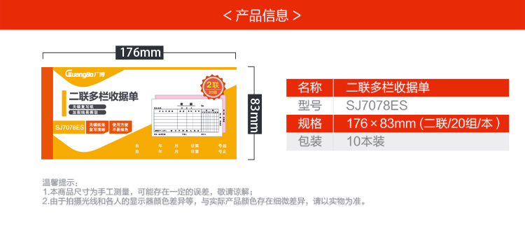 • 商品名稱:廣博(GuangBo)10本裝二聯(lián)多欄收據(jù)單無碳復(fù)寫 經(jīng)典款ZSJ7078ES