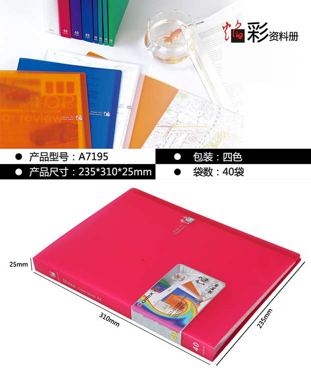 • 商品名稱(chēng):齊心(Comix) 5個(gè)配色裝 A4焰彩資料冊(cè)/文件夾 40頁(yè)文件冊(cè) A7195