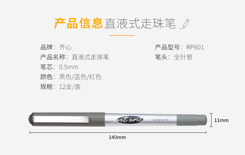 • 商品名稱:齊心(COMIX)0.5mm 黑色針管型直液式走珠簽字筆學(xué)生考試中性筆 12支/盒RP601