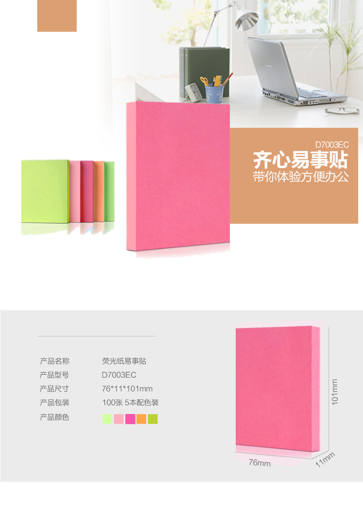 • 商品名稱:齊心(Comix)D7003EC 熒光紙易事貼/便利貼/便簽紙/便簽本 5本配色裝 (76x101mm)100張/本