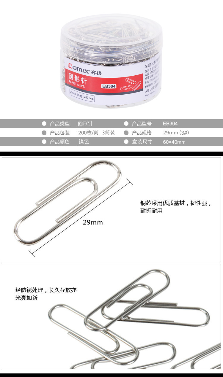 • 商品名稱:齊心(Comix) 29mm鍍鎳回形針/曲別針 200枚/筒 3筒裝 EB304