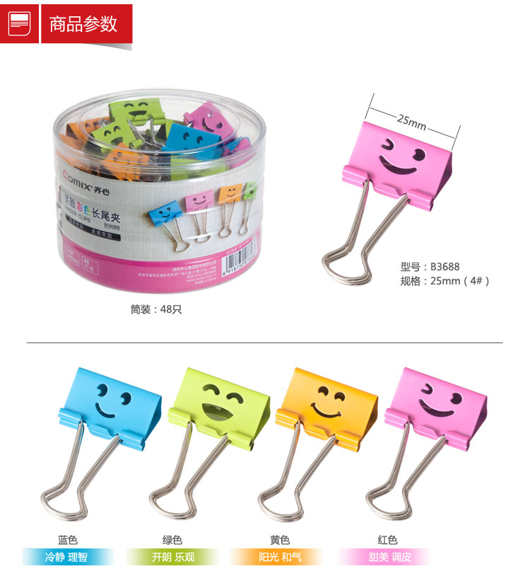 • 商品名稱:齊心(COMIX)48只裝25mm彩色笑臉長尾夾/長尾票夾 辦公文具B3688
