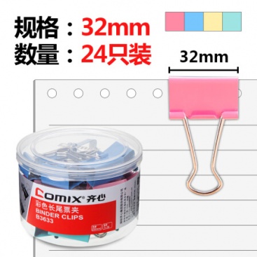 • 商品名稱(chēng):齊心(COMIX) 24只裝32mm彩色長(zhǎng)尾夾/票據(jù)夾/燕尾夾/鐵夾子 辦公文具 B3633