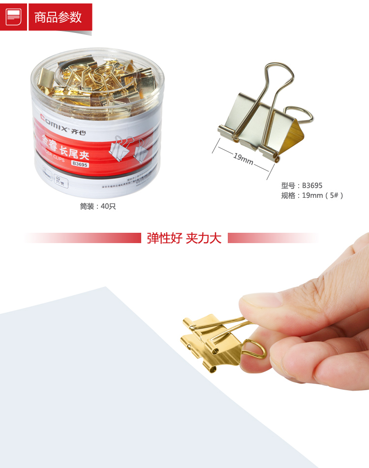 • 商品名稱:齊心(COMIX)40只裝19mm金色長(zhǎng)尾夾/長(zhǎng)尾票夾 辦公文具B3695