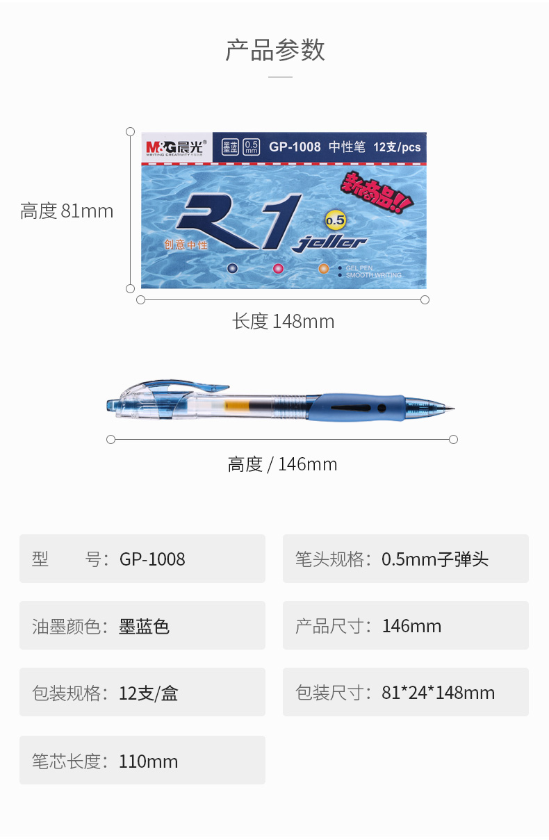 • 商品名稱(chēng):晨光(M&G)GP1008墨藍(lán)色0.5mm按動(dòng)中性筆子彈頭簽字筆水筆 12支/盒