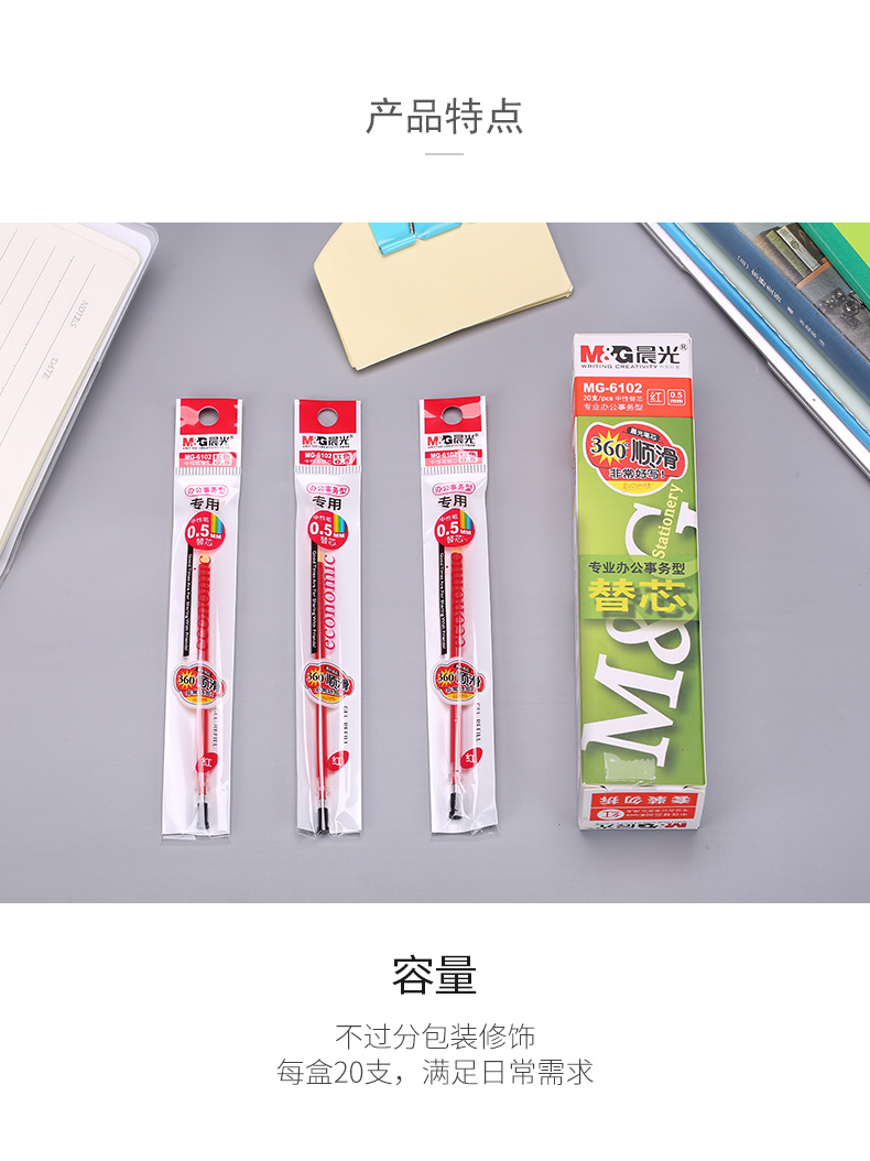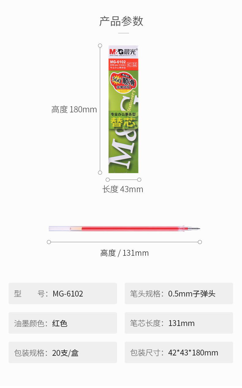 • 商品名稱:晨光(M&G)紅色0.5mm子彈頭中性筆簽字筆水筆替芯筆芯 20支/盒MG6102