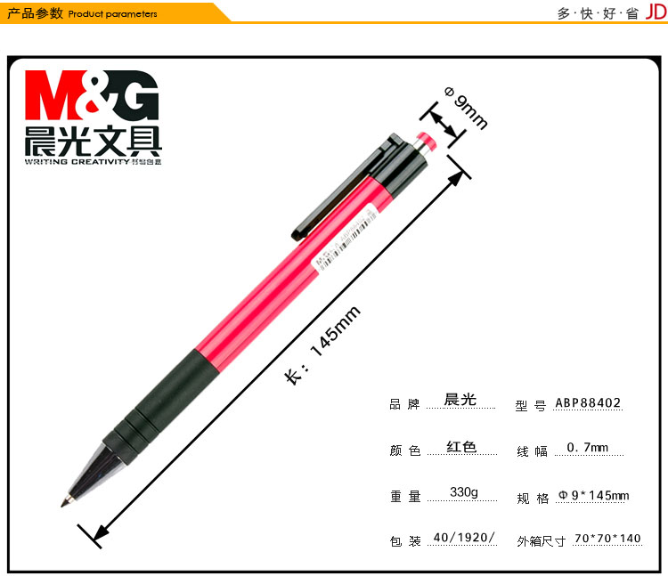 • 商品名稱:晨光(M&G)0.7mm紅色子彈頭按動圓珠筆中油筆原子筆 40支/盒ABP88402