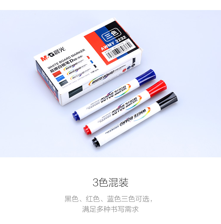 • 晨光(M&G)單頭白板筆可擦易擦辦公會(huì)議筆混裝(7黑+2藍(lán)+1紅) 10支/盒AWMY2232